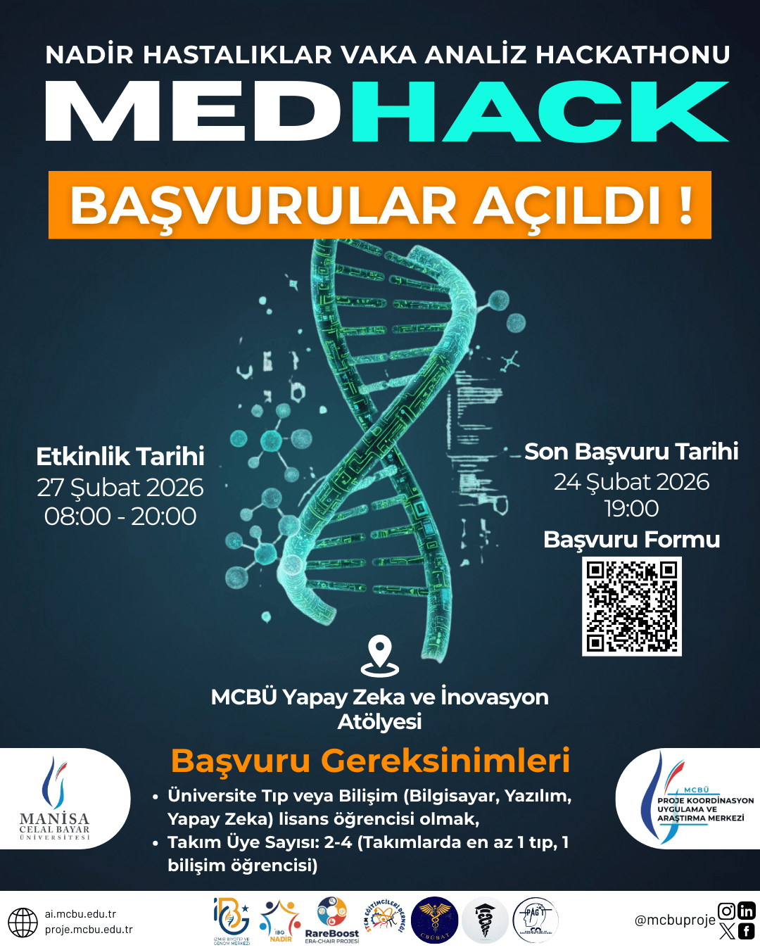 Manisa Celal Bayar Üniversitesi Proje Koordinasyon Uygulama ve Araştırma Merkezi tarafından düzenlenecek olan MEDHACK, sağlık alanında nadir hastalıklar teması etrafında tıp ve mühendislik disiplinlerini bir araya getiren, vaka temelli ve çözüm odaklı bir hackathon etkinliğidir. Etkinlik kapsamında katılımcı takımlar, kendilerine sunulan hasta belirtileri üzerinden olası nadir hastalıkları analiz edecek, klinik karar destek yaklaşımları geliştirecek ve teknolojik çözümler üretecektir.